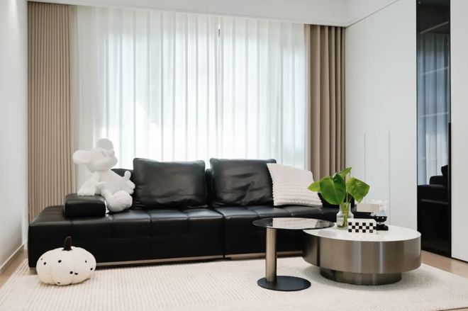 此外,在整个公区的色调上,设计师选择了经典的黑白灰搭配,辅以玻璃和金属元素,形成了现代感十足的视觉效果。这样的设计不仅突出了年轻夫妻的个性,也让整个家居环境显得更具层次感。