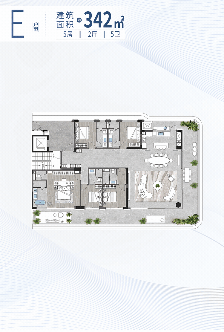全系一梯一户,其270°全景端厅,将“客厅+餐厅+厨房+阳台”形成一个LDKB连贯空间,通透无柱,环幕式视野无限开阔,打造家族社交门面。
