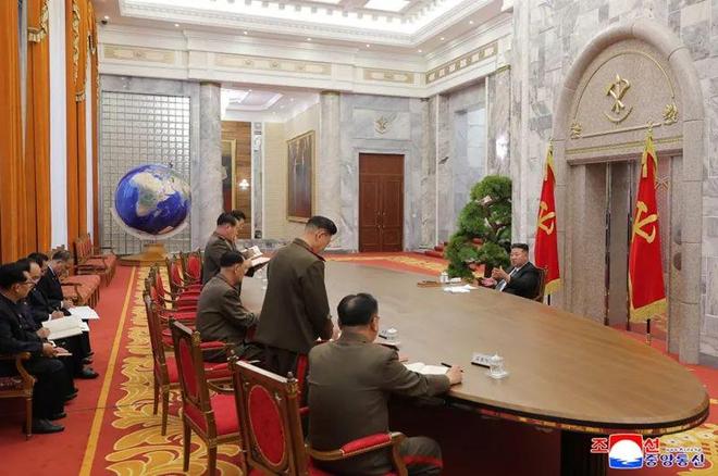 扩大会议中的小范围会议。金正恩对面是七位军委委员,包括朴正天、努光铁、李永吉、郑京择、吴日晶、金正植、赵庆喆;军委委员后排是四位劳动党干部,包括赵甬元、李熙用、金才龙、朱昌日。缺席的军委委员包括李昌浩、方头燮、金兆国;赵甬元似乎已经不再担任军委委员职务